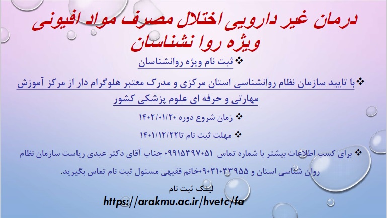 برگزاری دوره آموزشی و مهارتی اختلال مصرف مواد افیونی ویژه روان شناسان ۱۵ اسفند ۱۴۰۱ | ۰۸:۴۰ کد : ۳۲۸۶۷ اطلاعیه ارسال به دیگران نام شما ایمیل شما ایمیل دریافتکننده ارسال انصراف تعداد بازدید:۲۰۷۸۴ لینک ثبت نام