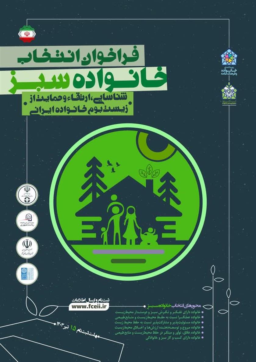 همایش ملی با عنوان خانواده سبز با هدف ترویج تصویری پویا ، مولد و بالنده از خانواده دوستدار محیط زیست و نهادینه سازی سبک زندگی سبز و پایدار در مسیر آگاهی و توانمند سازی خانواده های ایرانی طراحی و با مشارکت معاونت آموزش و مشارکت های مردمی سازمان حفاظت محیط زیست کشور ، مورد اجرا قرار خواهد گرفت.