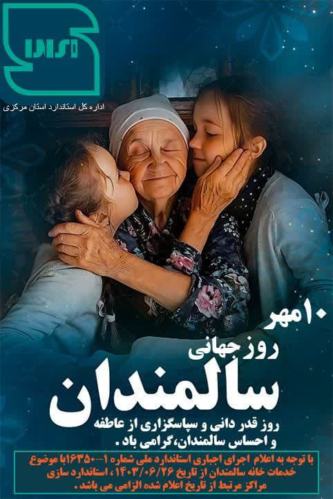 با عنایت به فرا رسیدن 10 مهر ماه مصادف با روز جهانی سالمندان ضمن تکریم این روز به اطلاع می رساند بر اساس اعلام سازمان ملی استاندارد ایران ، خدمات خانه سالمندان طی استاندارد شماره 1 - 16350 از تاریخ ۱۴۰۳/۶/۲۶ الزامی اعلام گردیده است.