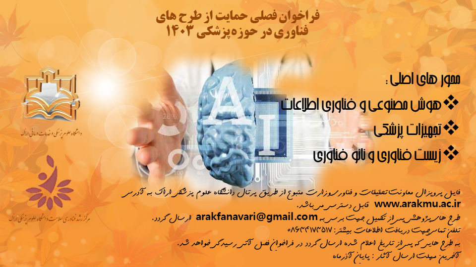 فراخوان فصلی "حمایت از طرح های فناوری در حوزه علوم پزشکی" توسط گروه فناوری سلامت دانشگاه علوم پزشکی اراک به اعضای محترم هیئت علمی، دانشجویان و سایر گروه های ذیربط اعلام می گردد. محورهای اصلی فراخوان به شرح ذیل می باشد.