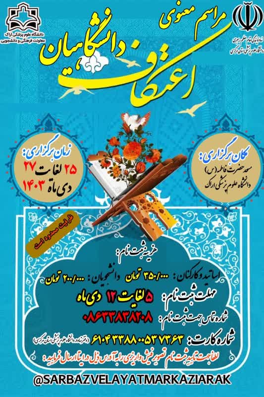 بنا بر اعلام دفتر نهاد نمایندگی مقام معظم رهبری در دانشگاه علوم پزشکی اراک،  مراسم معنوی اعتکاف دانشگاهیان به شرح پیوست برگزار می گردد.