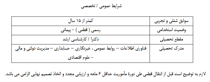 اداره کل امور اقتصادی و دارایی استان در نظر دارد اقدام به جذب و بکارگیری نیرو از سایر دستگاه های اجرایی استانی تابع قانون مدیریت خدمات کشوری به صورت انتقالی بر اساس شرایط عمومی و تخصصی مندرج در جدول ذیل (پس از طی فرایندهای قانونی از جمله مصاحبه تخصصی و فنی و تایید کمیته سرمایه انسانی) نماید.