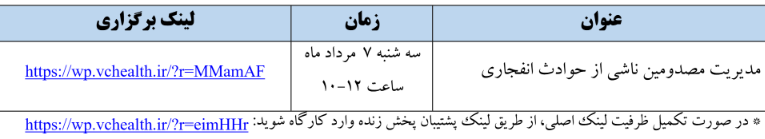 موسسه عالی تربیت و توسعه مدیران نظام سلامت وزارت بهداشت در نظر دارد با همکاری ستاد هماهنگی بهداشت و درمان استان تهران، پیرو سلسله کارگاه های غیرحضوری مدیریت بحران و بلایا، کارگاه غیر حضوری با محوریت مدیریت مصدومین ناشی از حوادث انفجاری را به شرح ذیل برگزار نماید.
