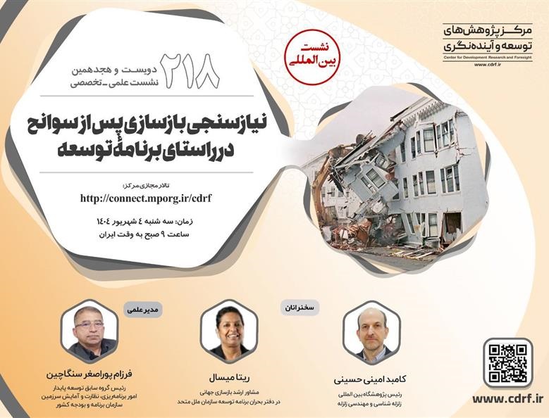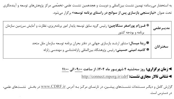نشست علمی نیاز سنجی بازسازی سوانح در راستای برنامه توسعه ۰۳ شهریور ۱۴۰۴ | ۱۲:۳۷ کد : ۵۴۰۰۰ اطلاعیه ارسال به دیگران نام شما ایمیل شما ایمیل دریافتکننده ارسال انصراف تعداد بازدید:۲۰۵۰ نشست علمی نیاز سنجی بازسازی سوانح در راستای برنامه توسعه، توسط مرکز پژوهش های توسعه و آینده نگری برگزار می گردد.