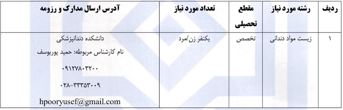 اعلام نیاز دانشگاه علوم پزشکی قزوین به یک نفر نیروی متعهد خدمت به صورت هیات علمی، در مقطع تخصص رشته زیست مواد دندانی