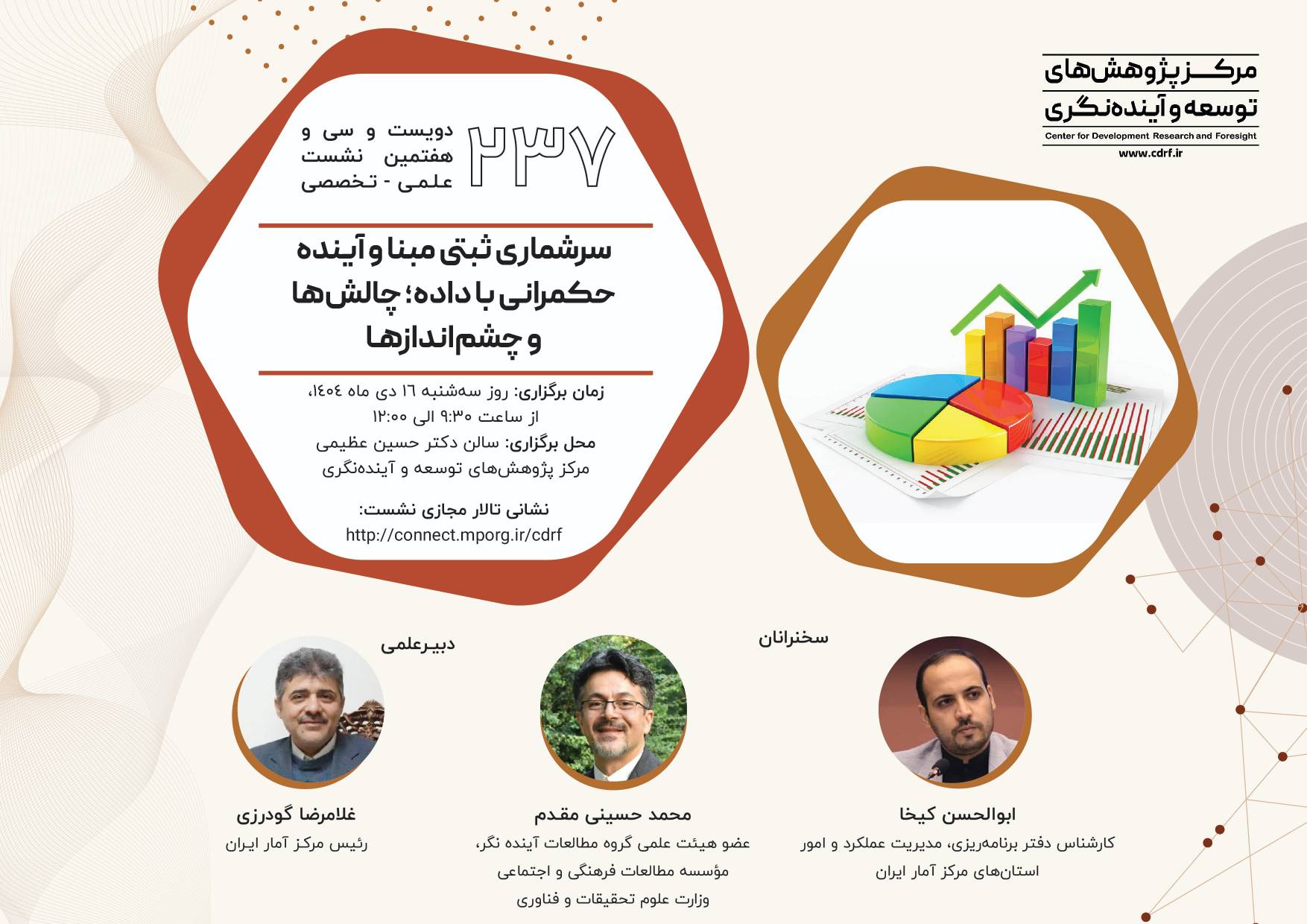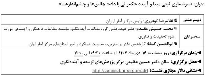 نشست علمی سرشماری ثبتی مبنا آینده حکمرانی با داده ۱۴ دی ۱۴۰۴ | ۱۰:۲۱ کد : ۵۷۴۱۸ اطلاعیه ارسال به دیگران نام شما ایمیل شما ایمیل دریافتکننده ارسال انصراف تعداد بازدید:۴۶۱ دویست وسی وهفتمین نشست علمی - تخصصی با عنوان سرشماری ثبتی مبنا آینده حکمرانی با داده، چالش ها وچشم اندازها