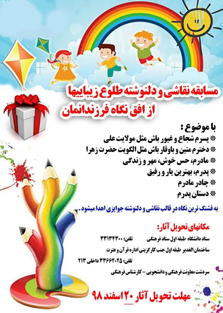 مسابقه نقاشی و دلنوشته طلوع زیبایی ها از افق نگاه فرزندانمان ۱۰ اسفند ۱۳۹۸ | ۰۹:۰۰ کد : ۷۸۷۰ اطلاعیه ارسال به دیگران نام شما ایمیل شما ایمیل دریافتکننده ارسال انصراف تعداد بازدید:۴۰۰۴۱